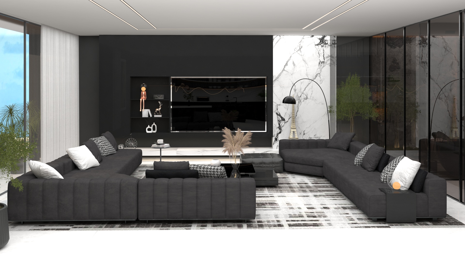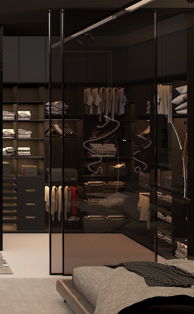 This studio embodies a bold and refined masculine style. The black walls create a deep, dramatic atmosphere, giving the space a sense of power and intimacy. Furniture in shades of black and grey adds harmony and texture, balancing darkness with subtle sophistication.